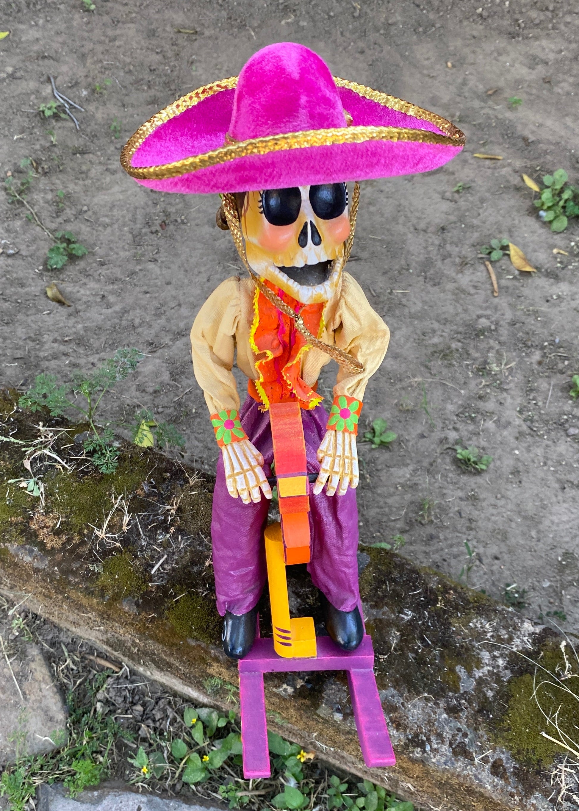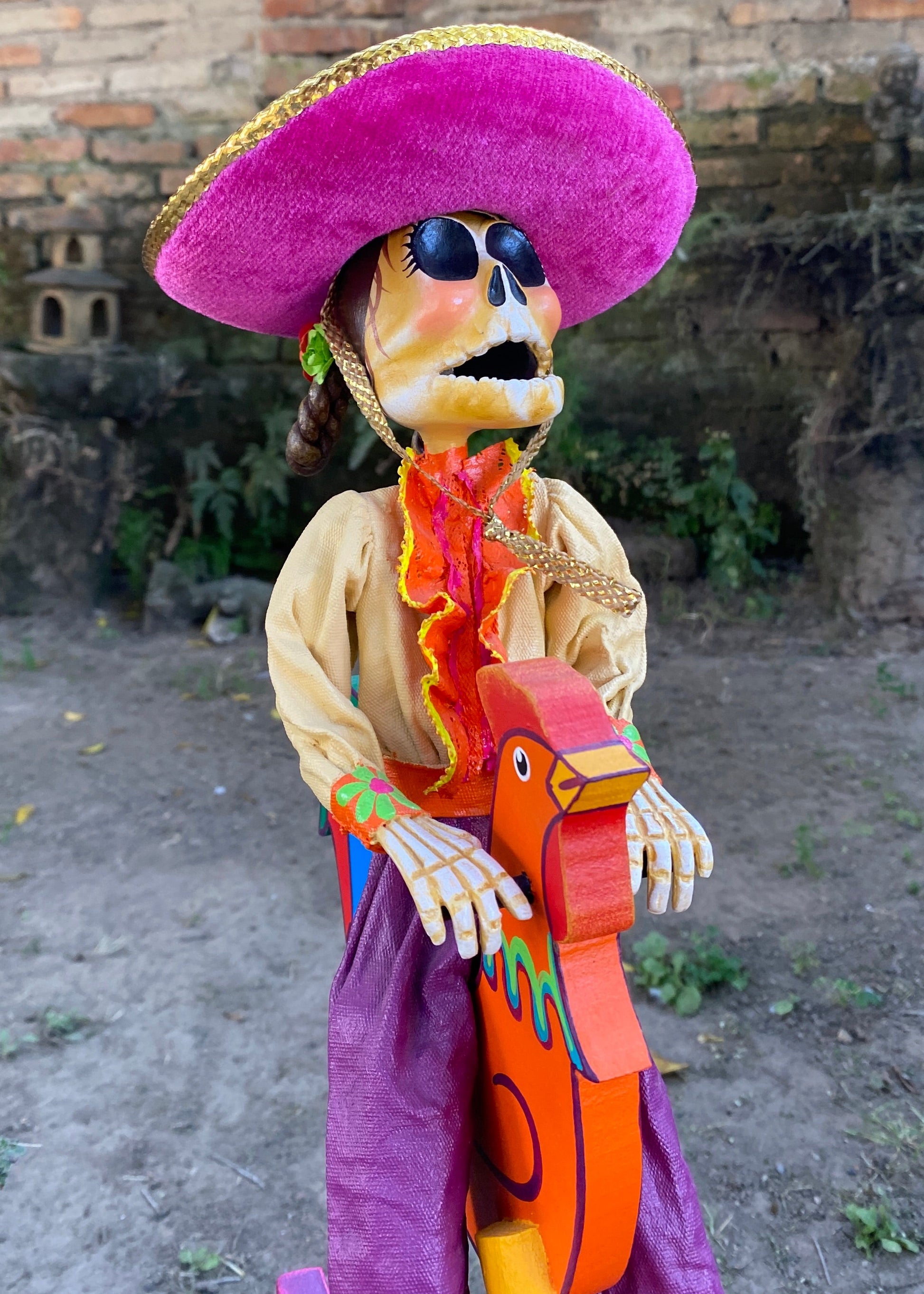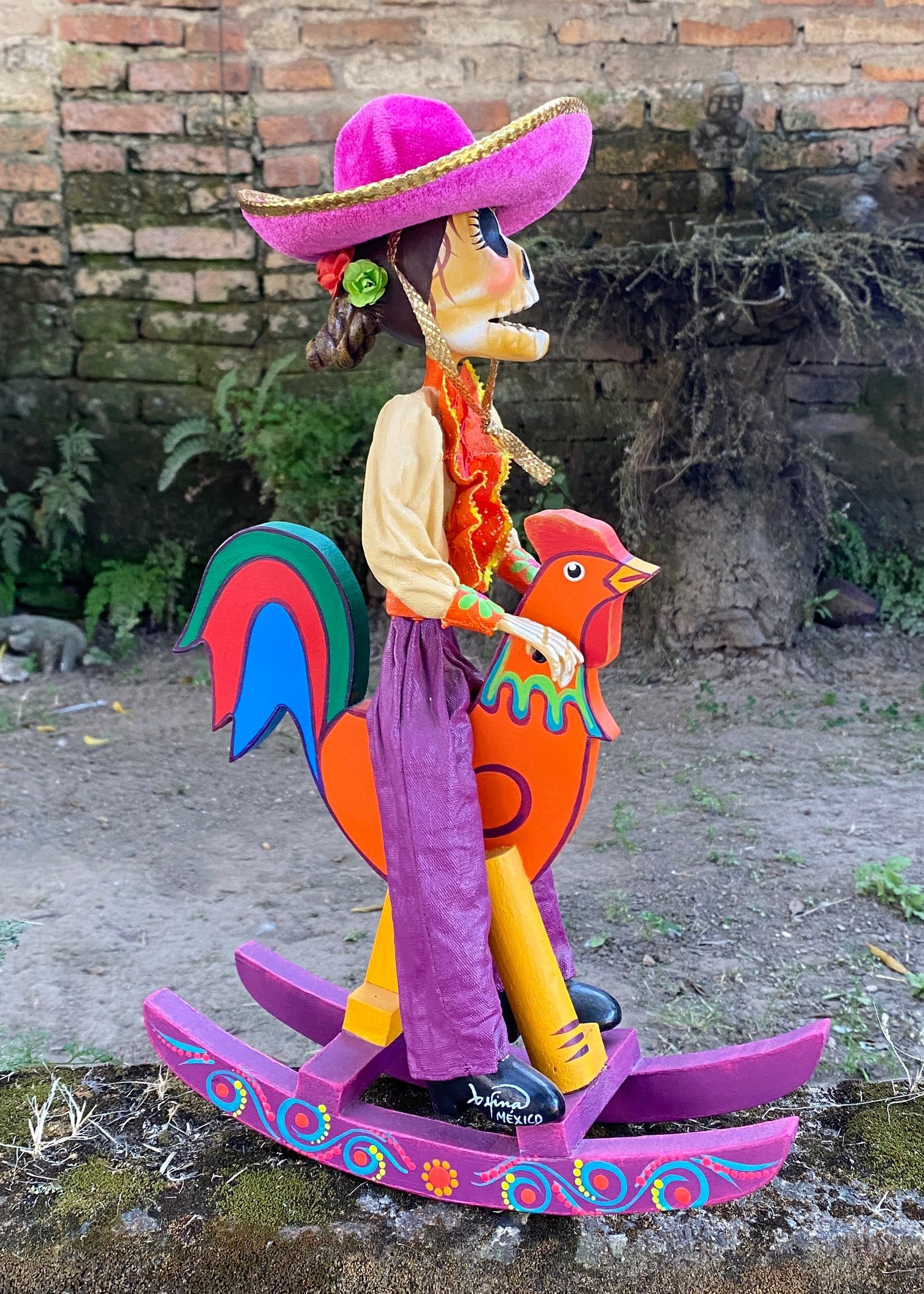 Calaverita de niña jugando en un gallito, viste un pantalón color bugambilia, su blusa es beige, los puños de las mangas están decorados con una flor pintada en azul, la ropa es de tela, sus manitas y su cara son de papel maché, está peinada con trencitas, su sombrerito está forrado de terciopelo, el gallito de juguete es de madera decorado con florecitas.