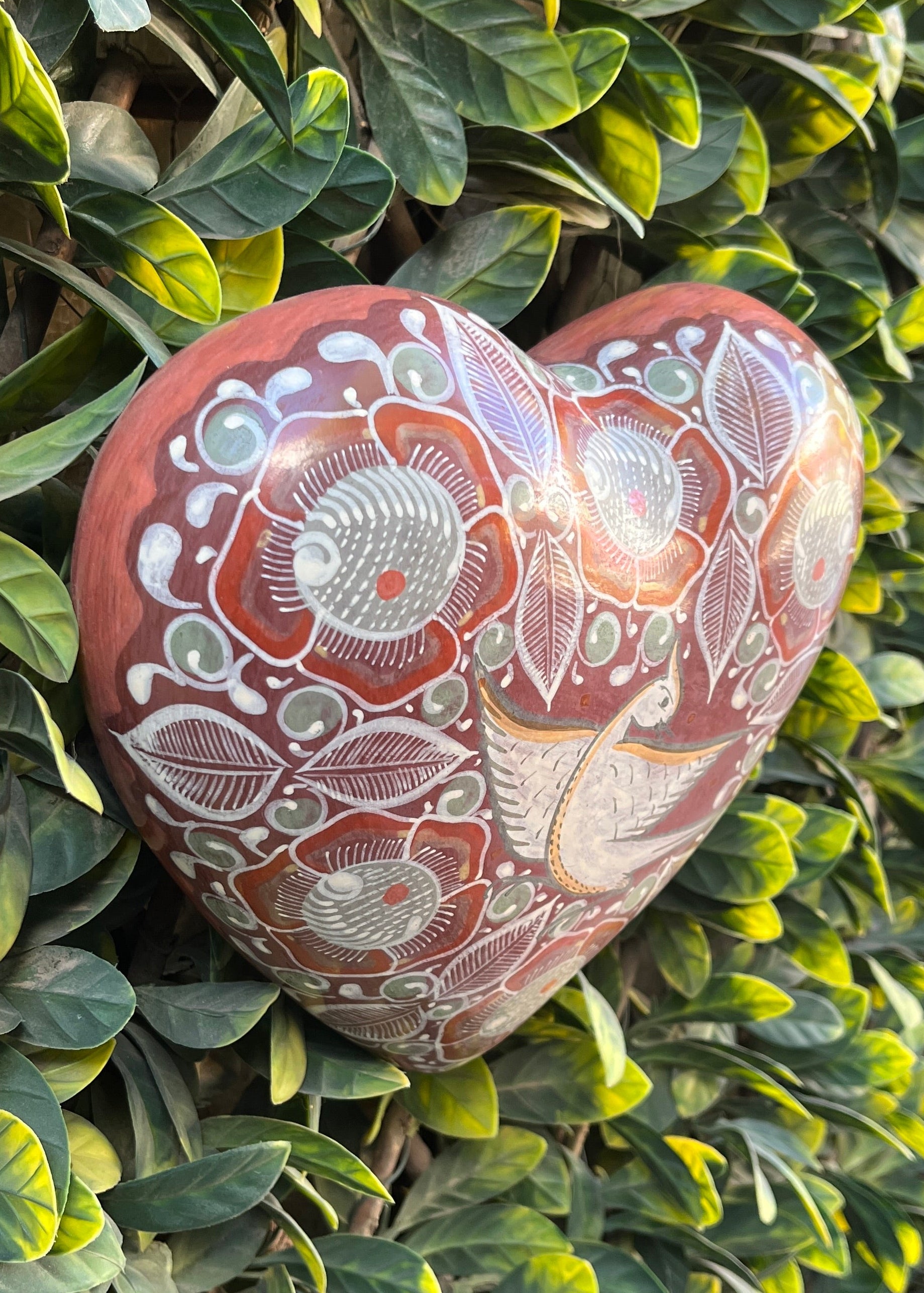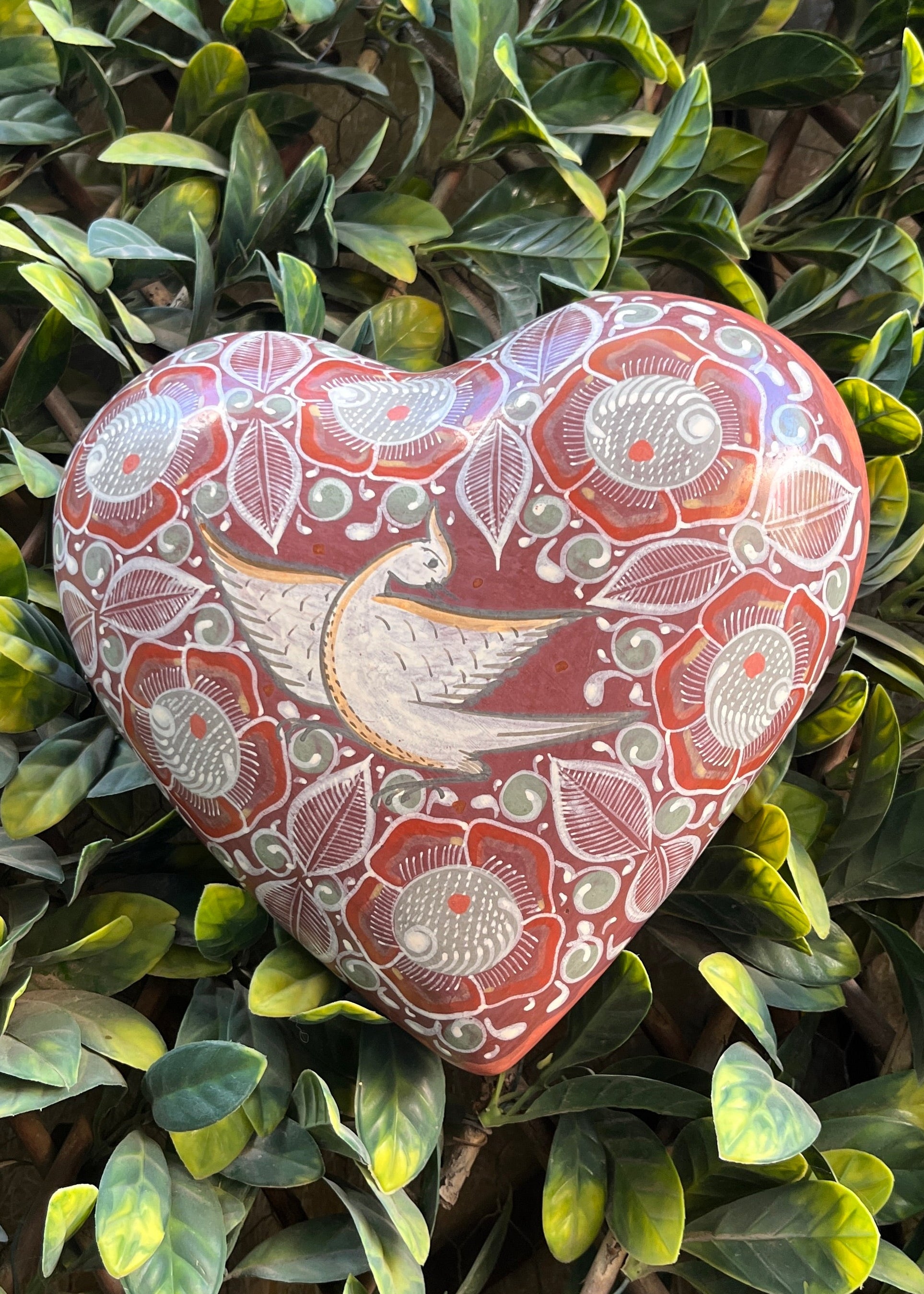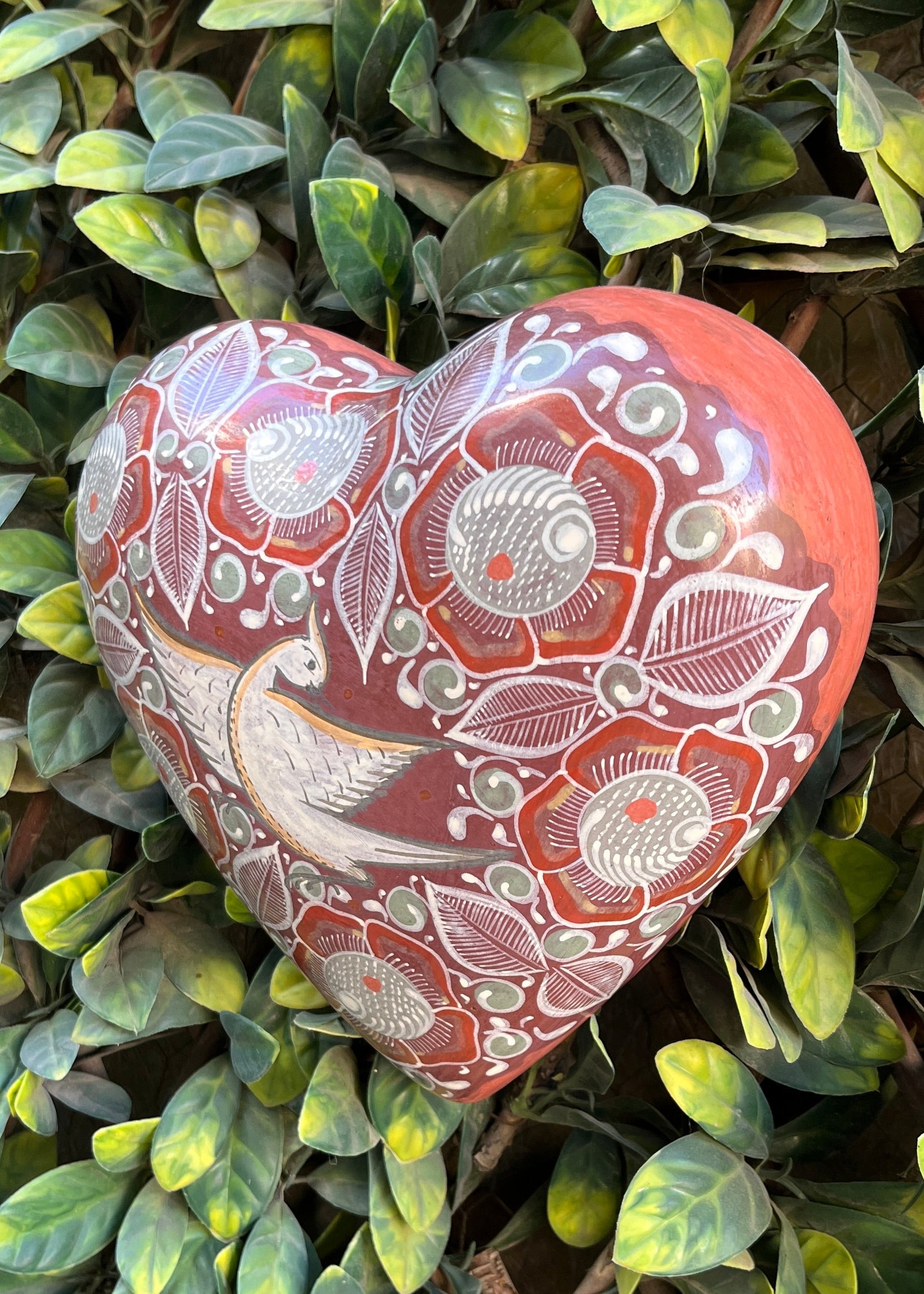 Corazón de barro bruñido para pared, todos sus detalles son pintados a mano con pigmentos de la tierra, el brillo natural lo obtiene a base de pulir la pieza con una piedra que se llama pirita.