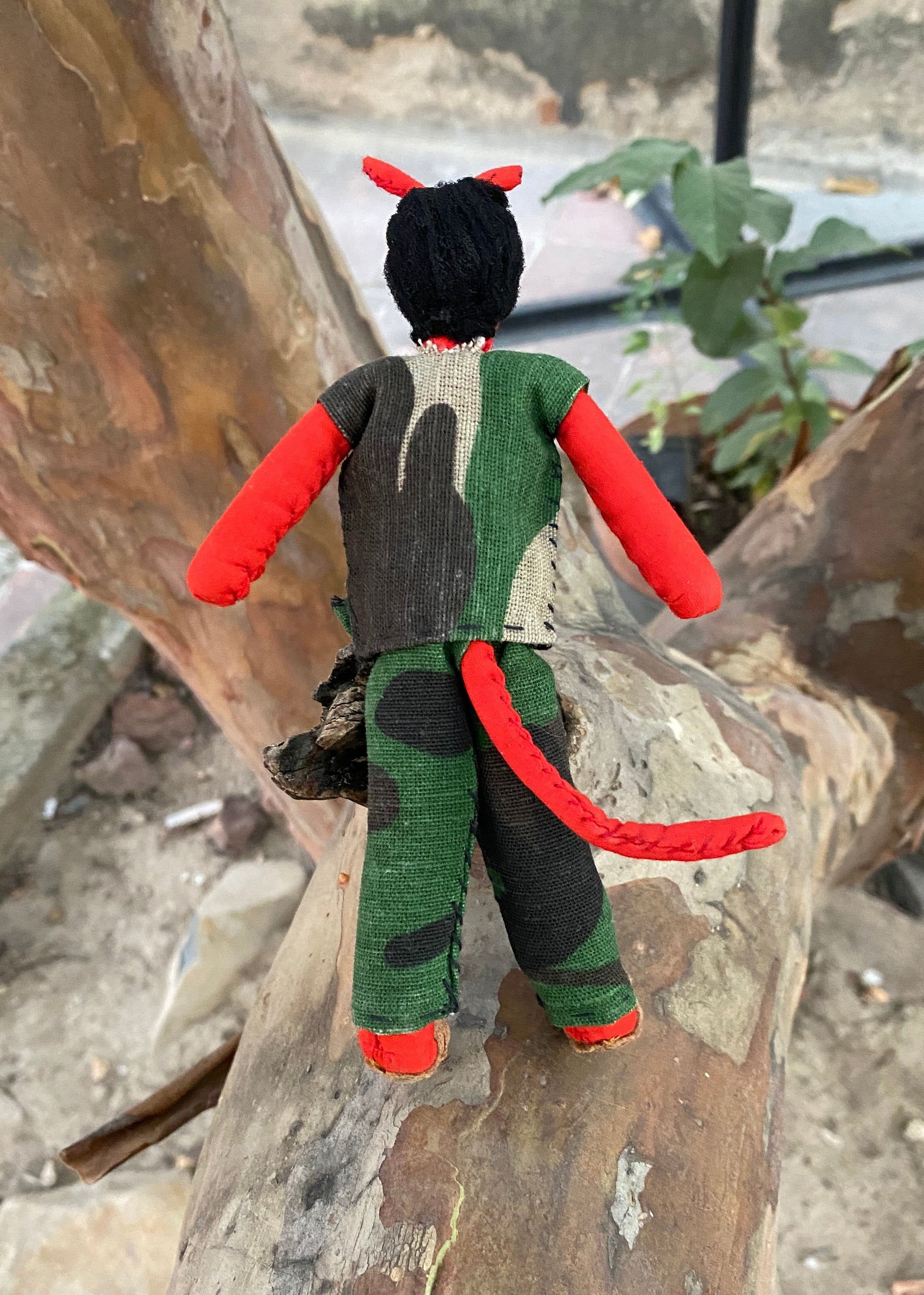 Diablito, muñeco de trapo elaborado totalmente a mano con paciencia y cariño por artesanos guanajuatenses. Su cuerpo está confeccionado con retazos de tela, con puntadas visibles qe nos reflejan el trabajo manual. No es perfectamente simetrico y es ahí donde reside su encanto de antaño. Su carita esta bordada a mano, su cabello es un trocito de media negra.