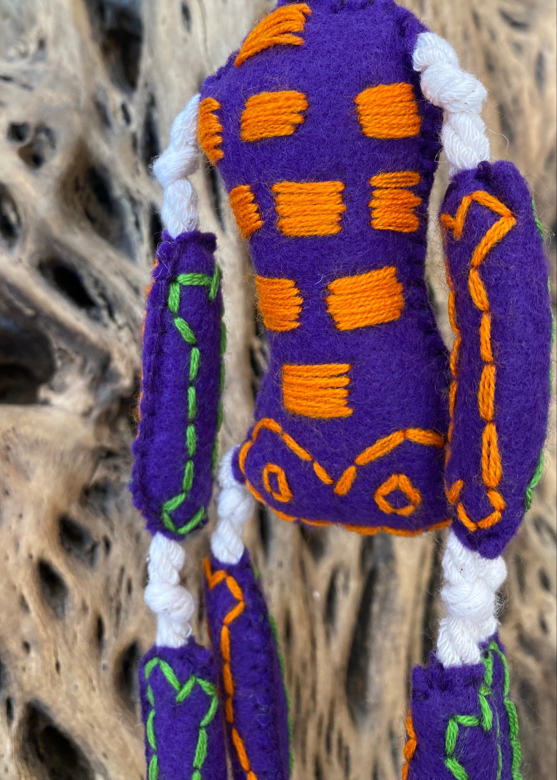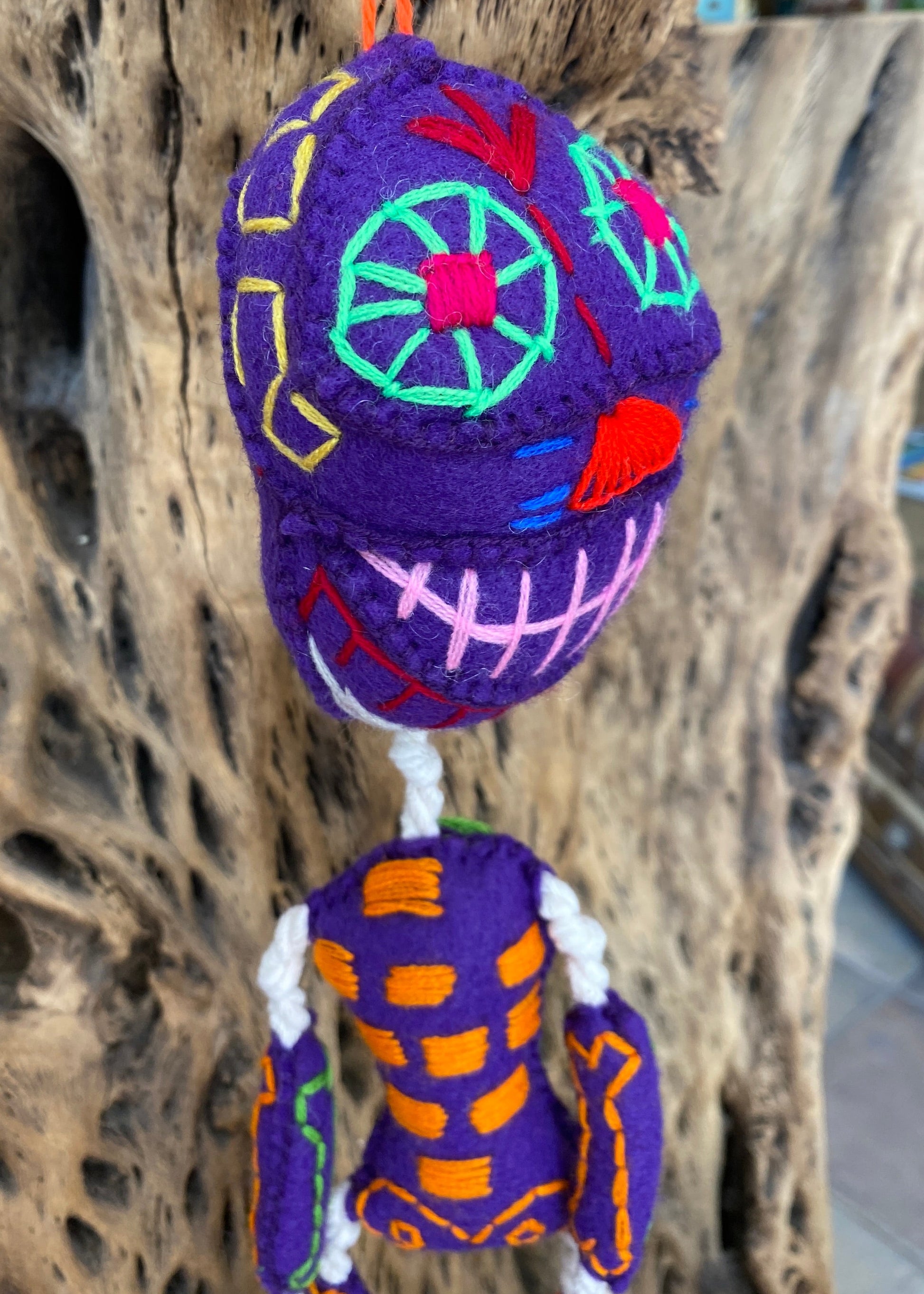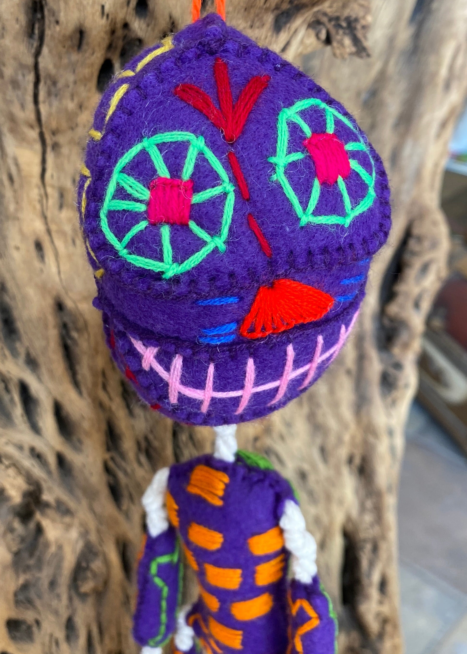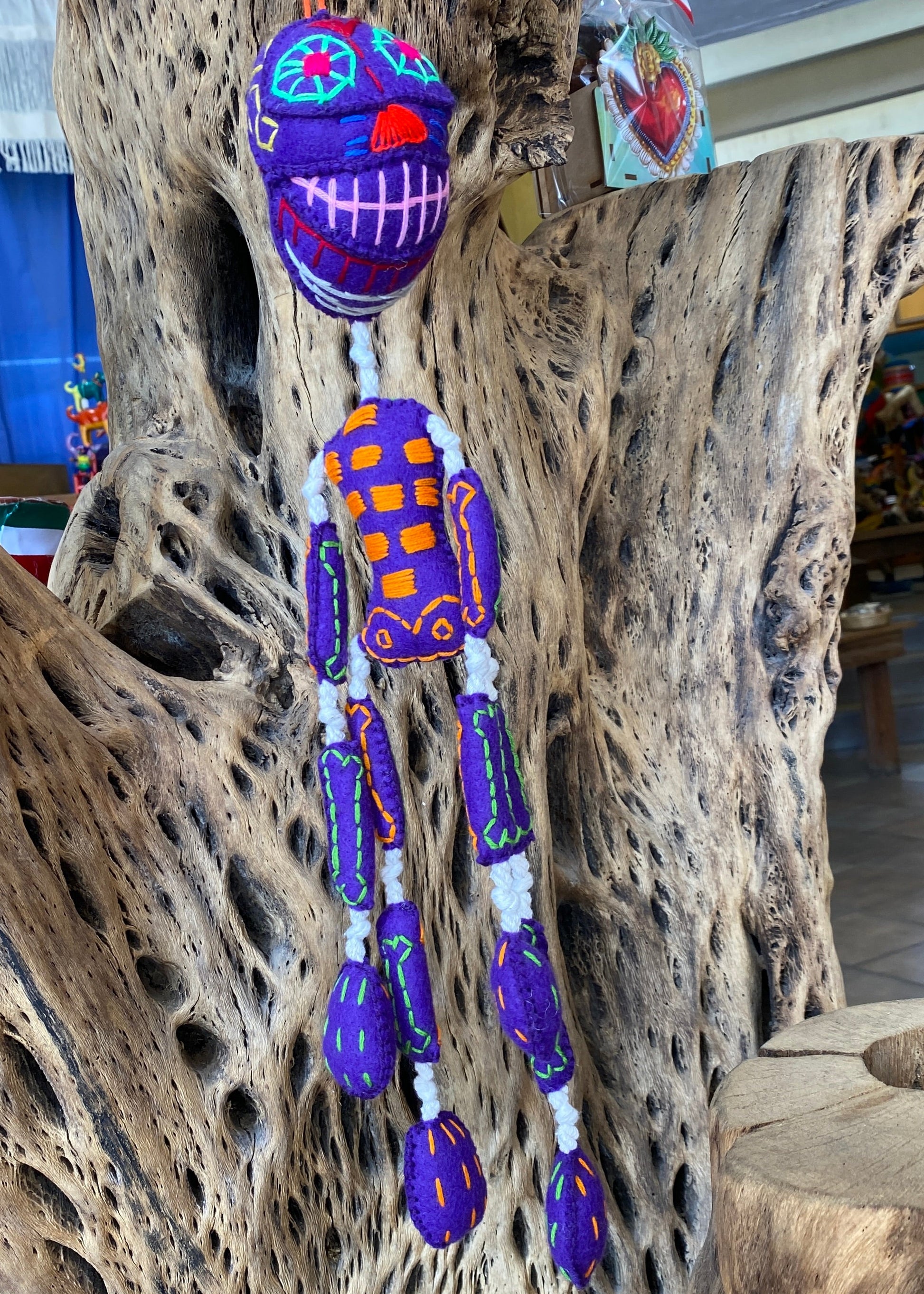 Esqueleto de lana hecho totalmente a mano, sus huesitos están bordados a mano al igual que su carita y torax, la unión entre huesito y huesito es con hilaza trenzada, hecho por artesanos de Guerrero.