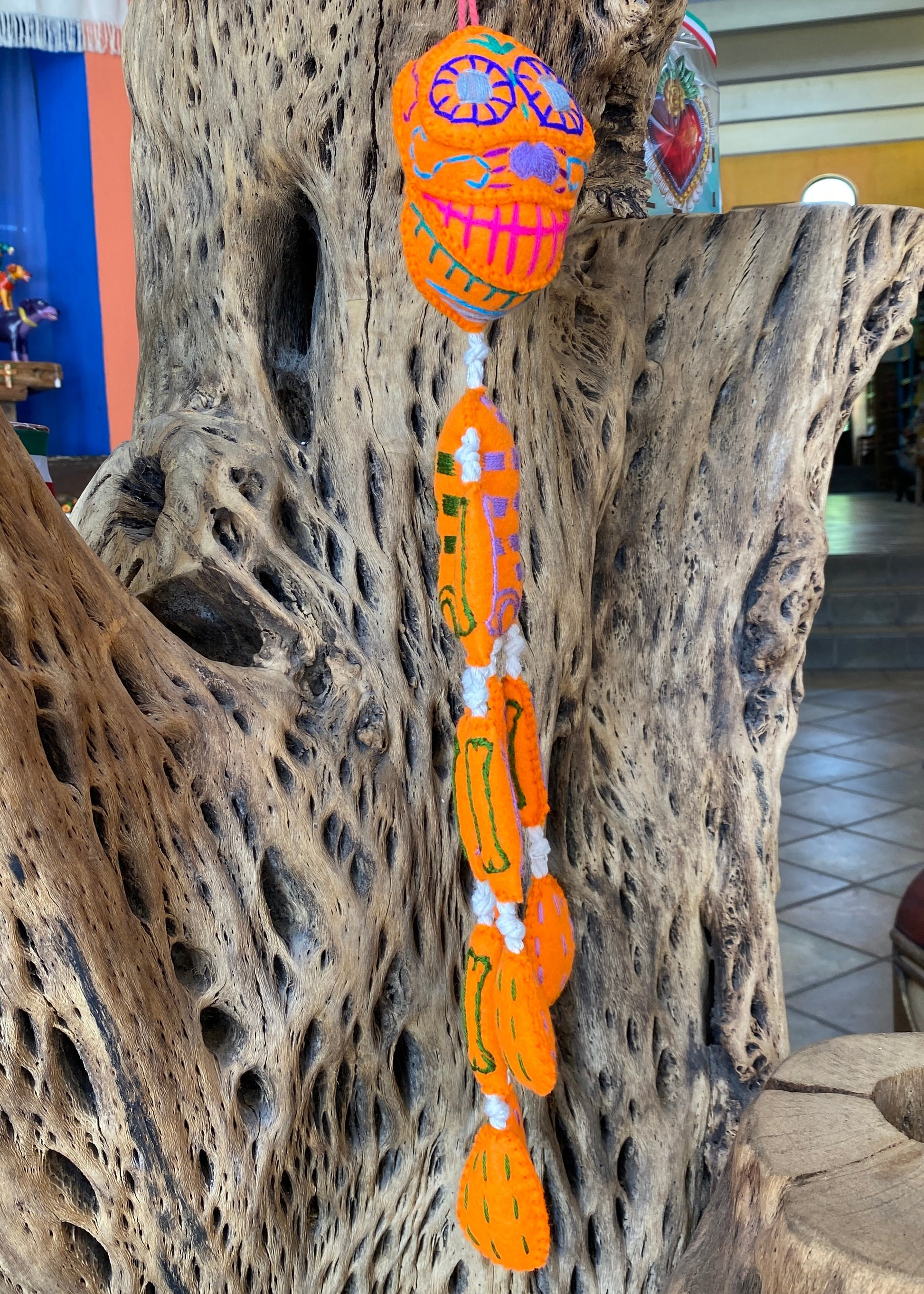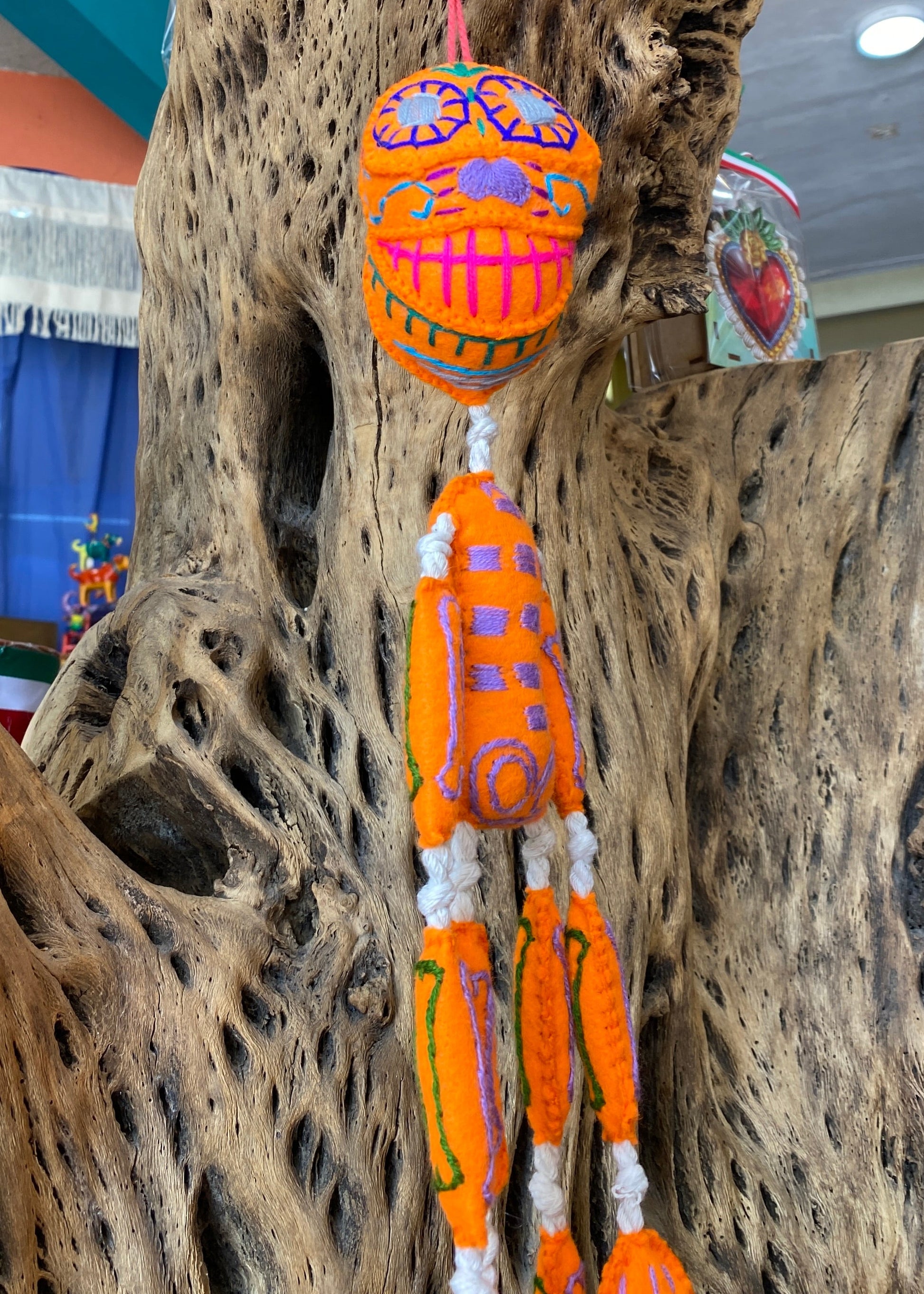 Esqueleto de lana hecho totalmente a mano, sus huesitos están bordados a mano al igual que su carita y torax, la unión entre huesito y huesito es con hilaza trenzada, hecho por artesanos de Guerrero.