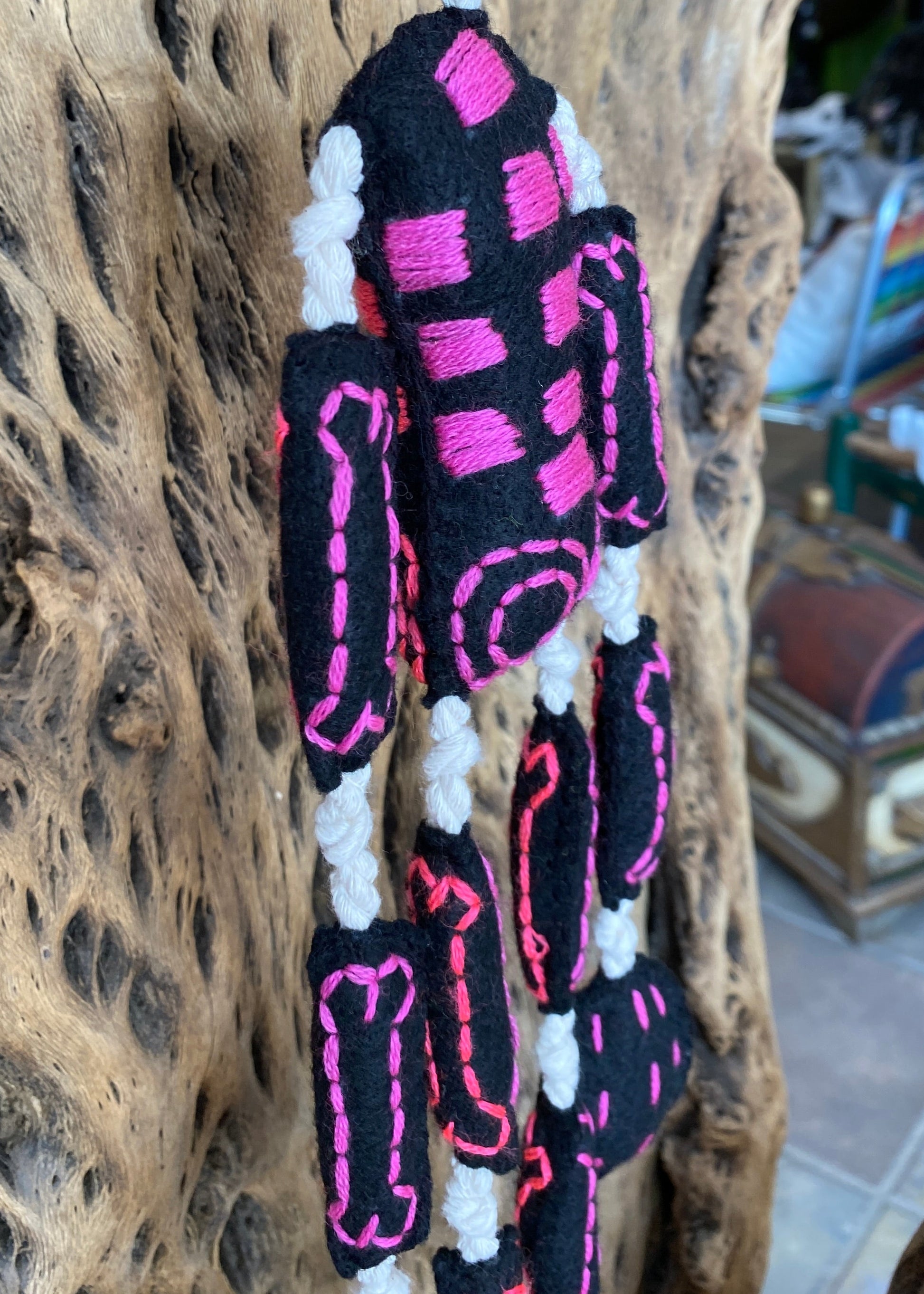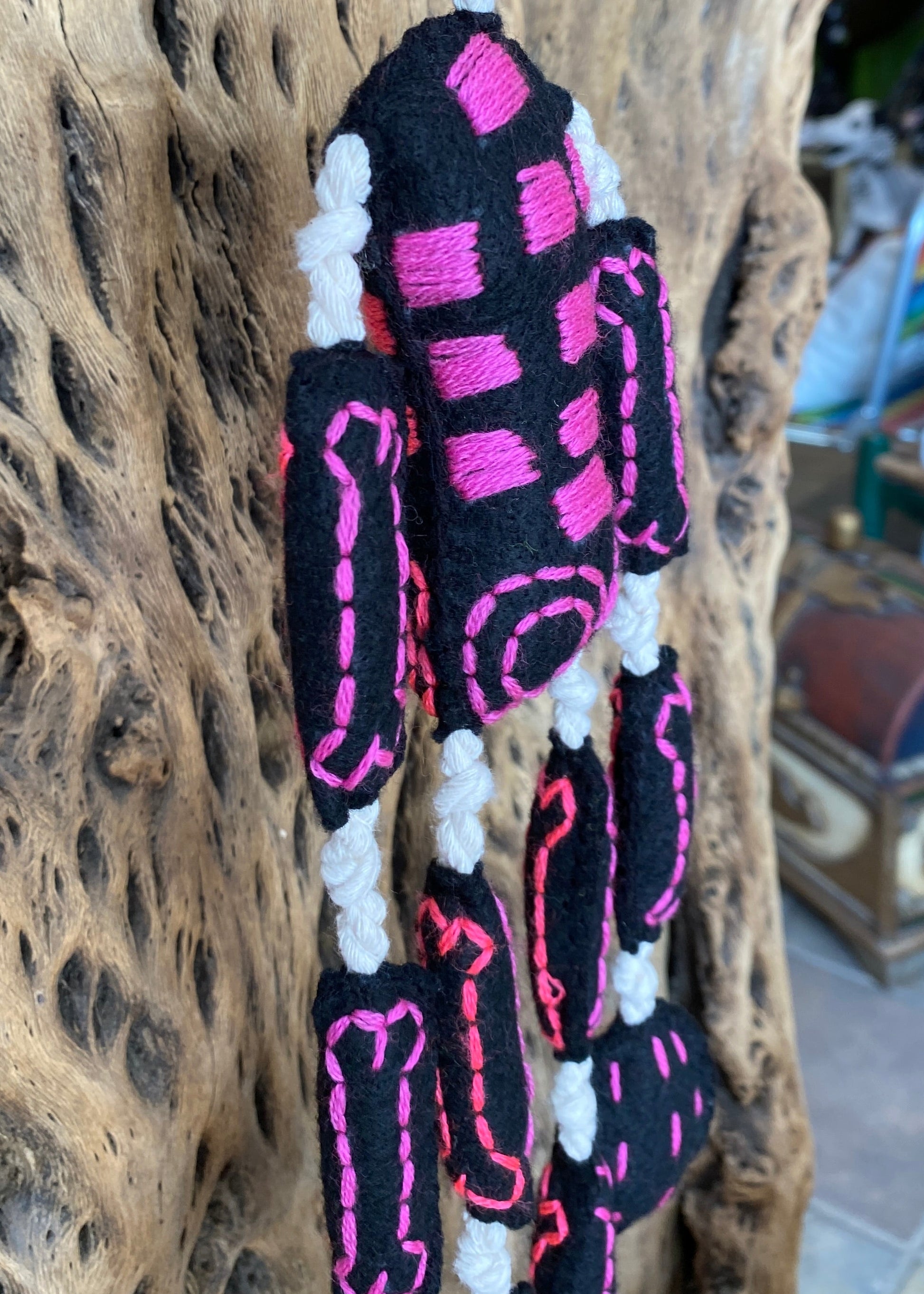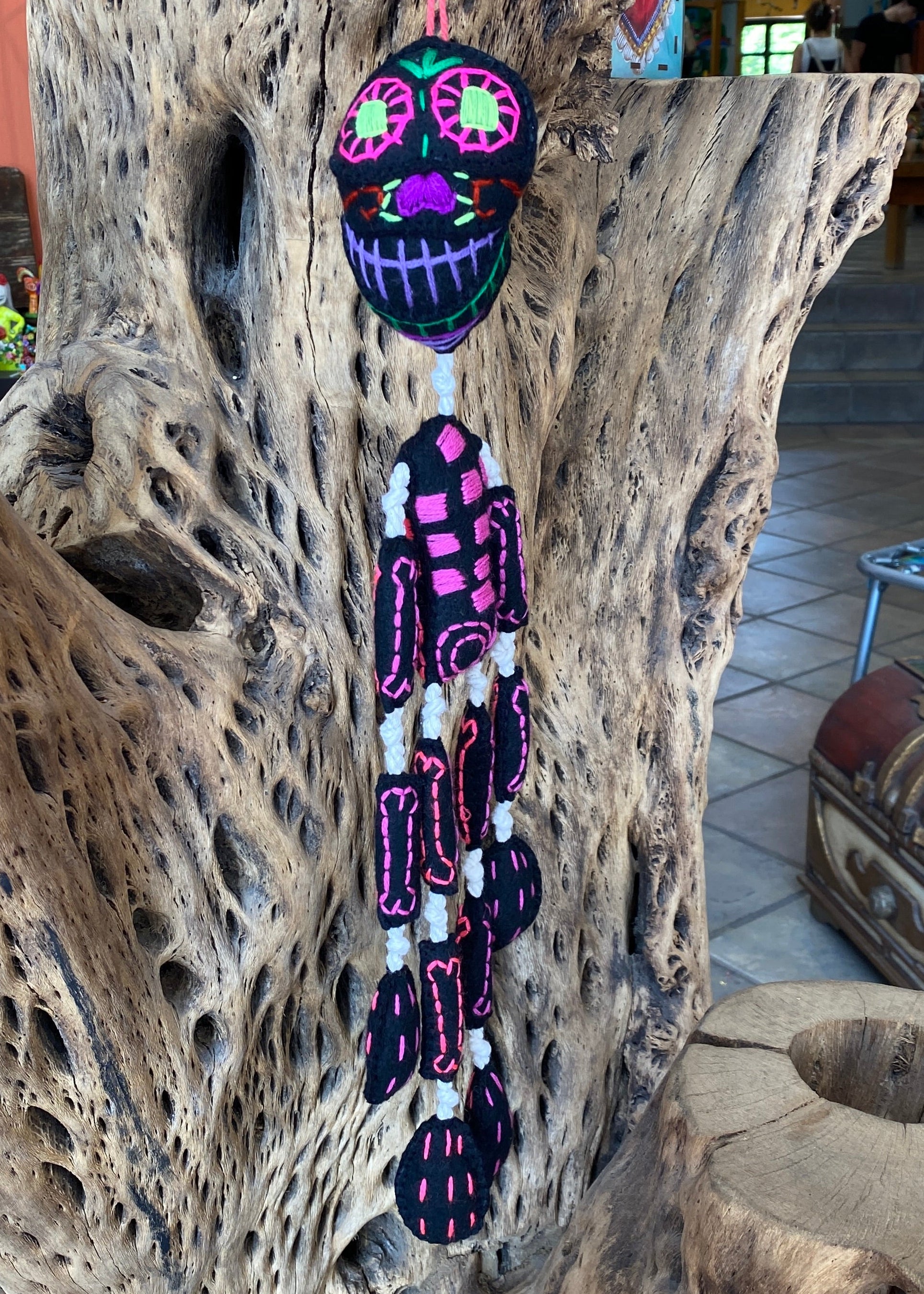 Esqueleto de lana hecho totalmente a mano, sus huesitos están bordados a mano al igual que su carita y torax, la unión entre huesito y huesito es con hilaza trenzada, hecho por artesanos de Guerrero.