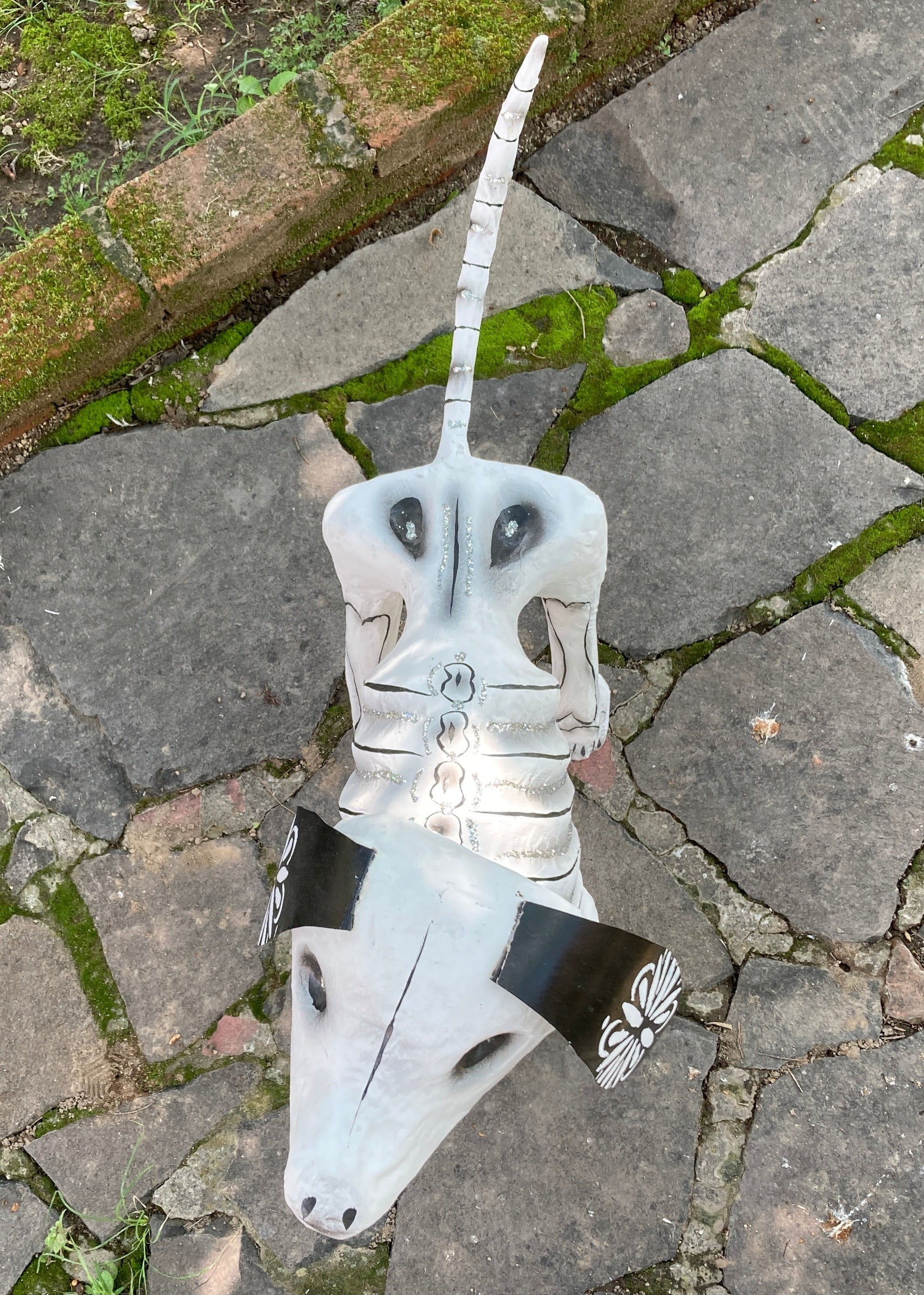 Perro esqueleto,elaborado con la tecníca de cartonería en color blanco, decorado con flores en su pecho y orejas, estas mismas son de piel sintetica, y con dealles en diamantina plata. La decoracion puede variar ya que está hecho a mano.