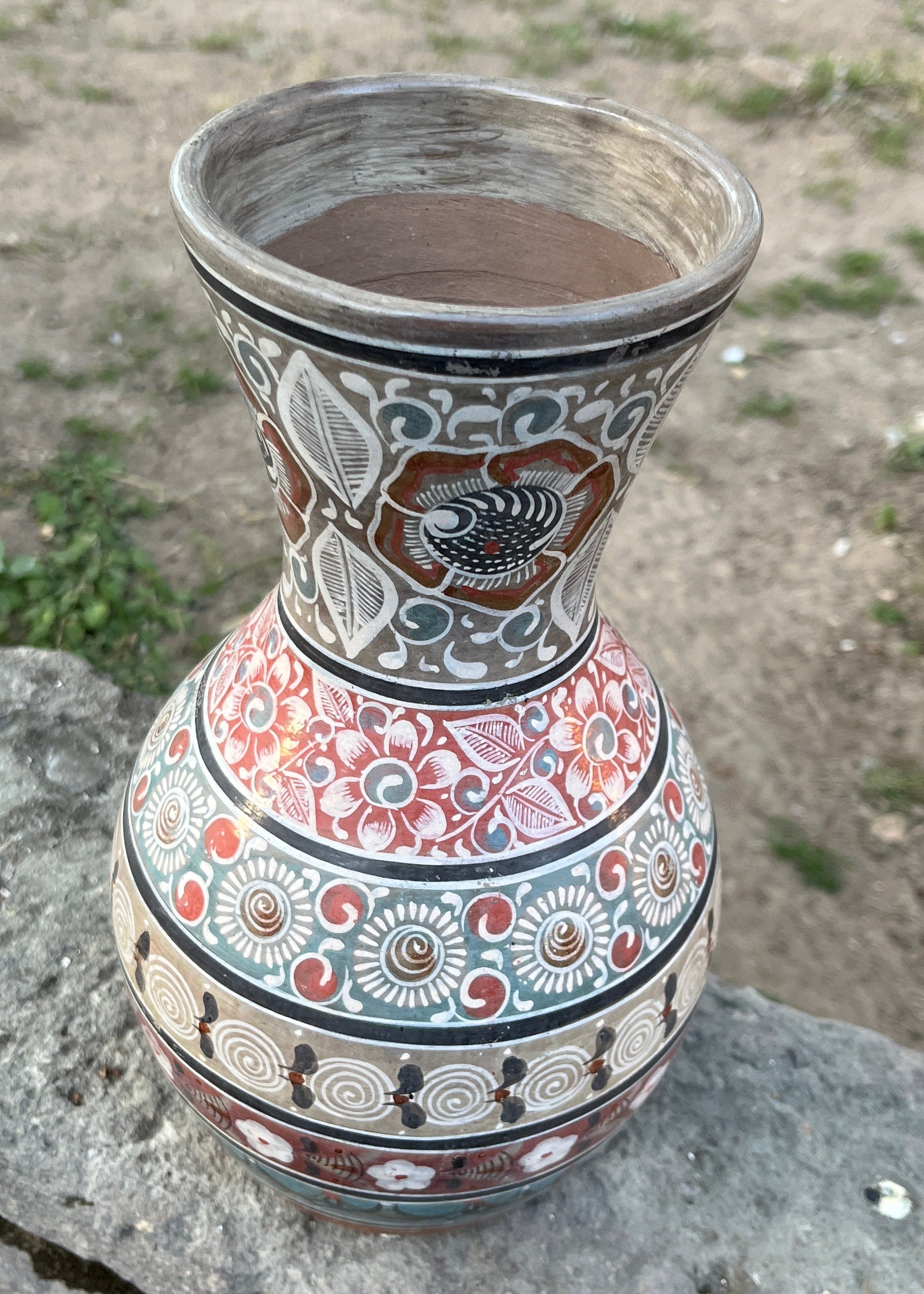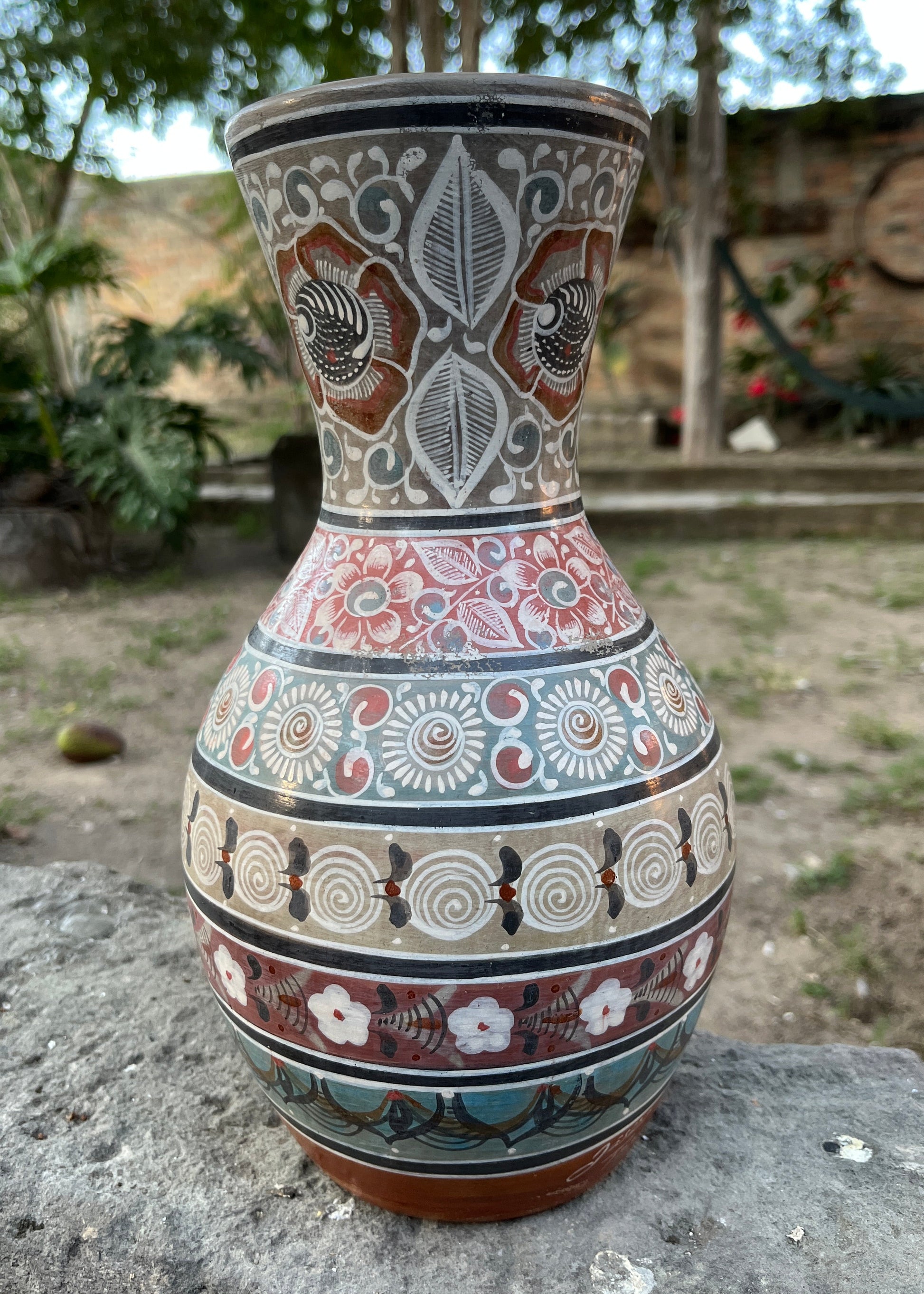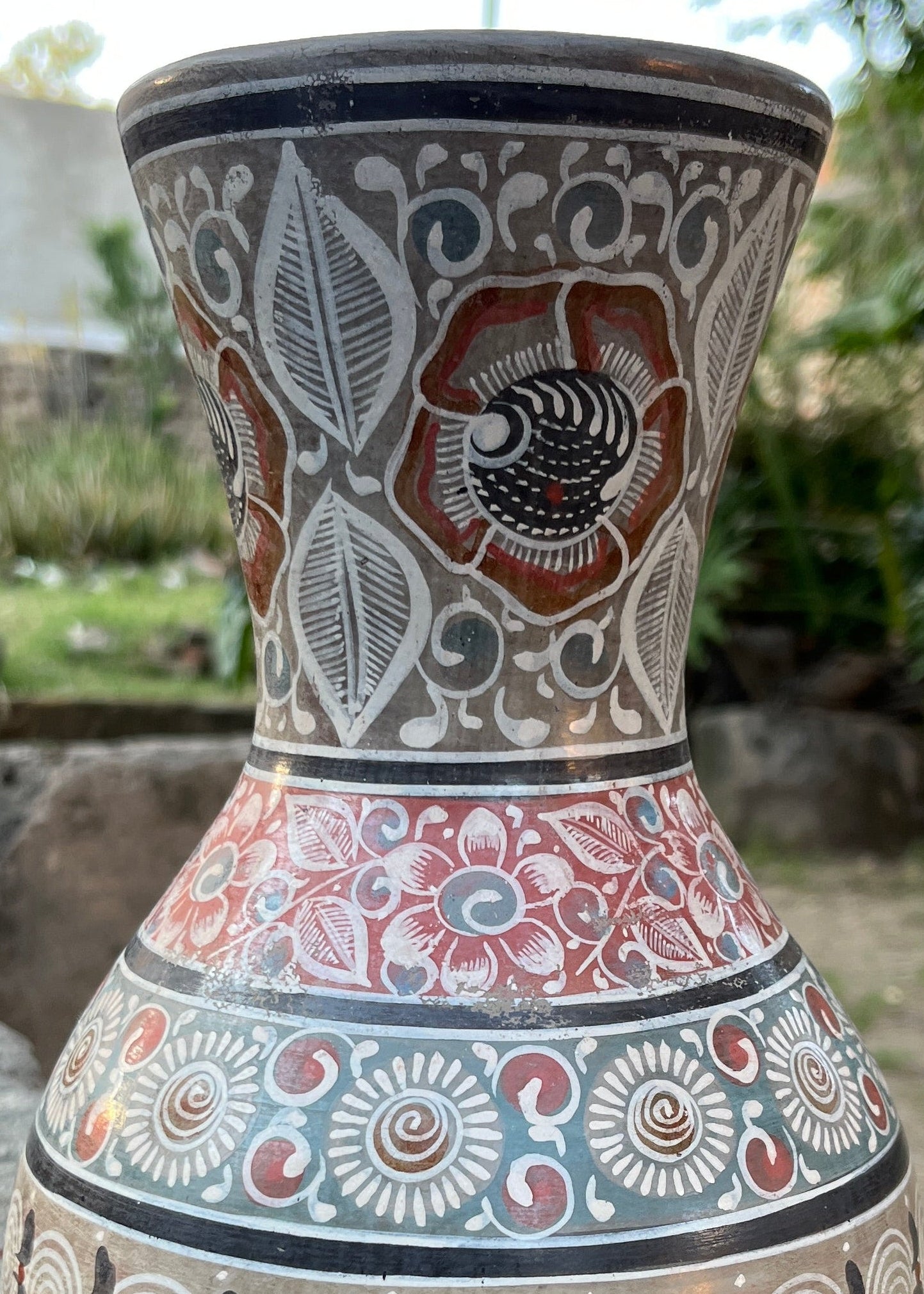 Jarrón de barro bruñido, su decoración está dividida en 6 franjas con diferentes flores y garigoles, todos sus detalles son pintados a mano con pigmentos de la tierra, el brillo natural lo obtiene a base de pulir la pieza con una piedra que se llama pirita. Su uso es de decoración.