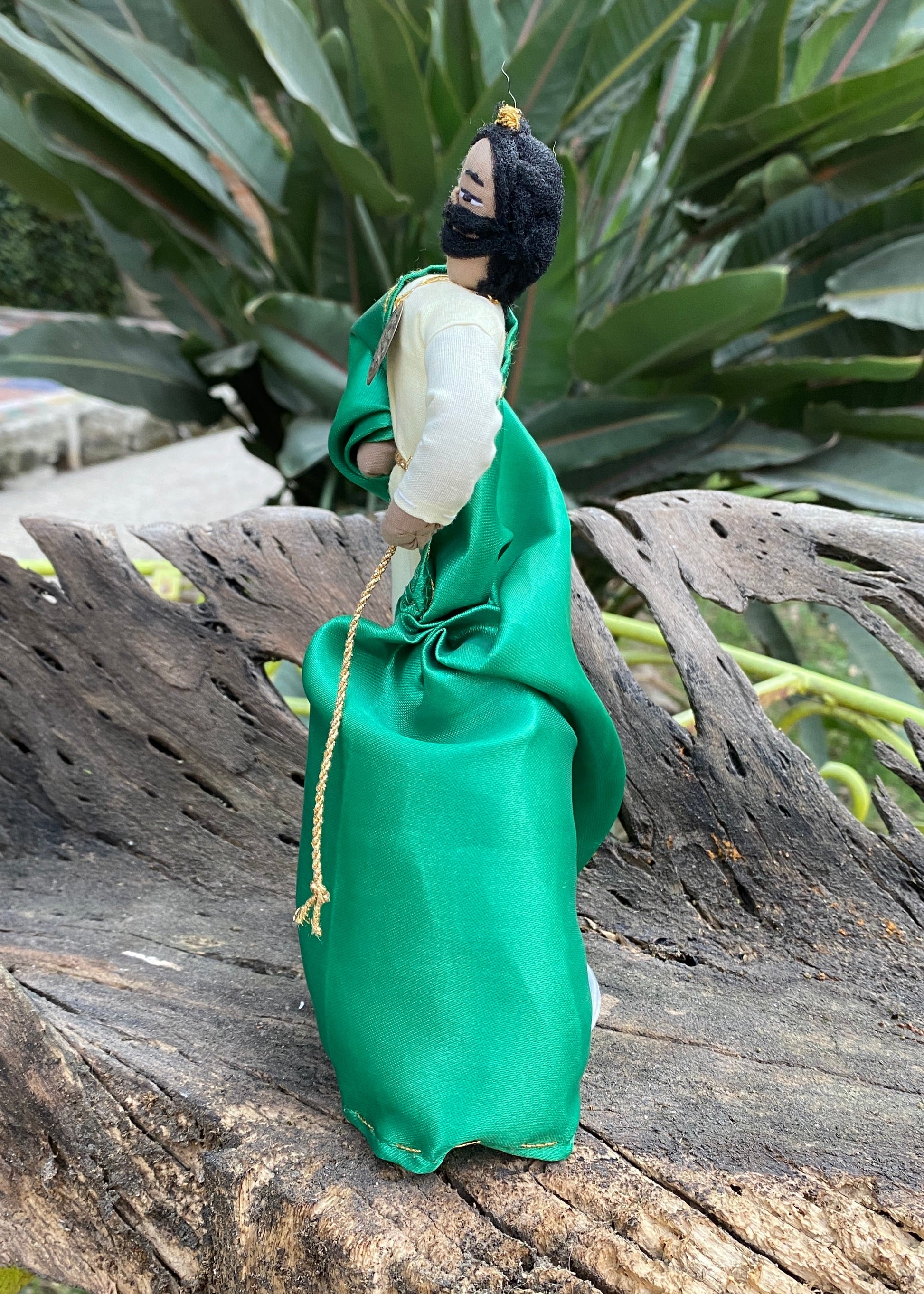 San Judas Tadeo, muñeco de trapo elaborado totalmente a mano con paciencia y cariño por artesanos guanajuatenses. Su cuerpo está confeccionado con retazos de tela, con puntadas visibles qe nos reflejan el trabajo manual. No es perfectamente simetrico y es ahí donde reside su encanto de antaño. Su carita esta bordada a mano y su barba y cabello es un trocito de media negra, en la parte de arriba de su cabeza tiene un pequeño detalle que simula la flamita de fuego que simboliza el descenso del Espiritu Santo.