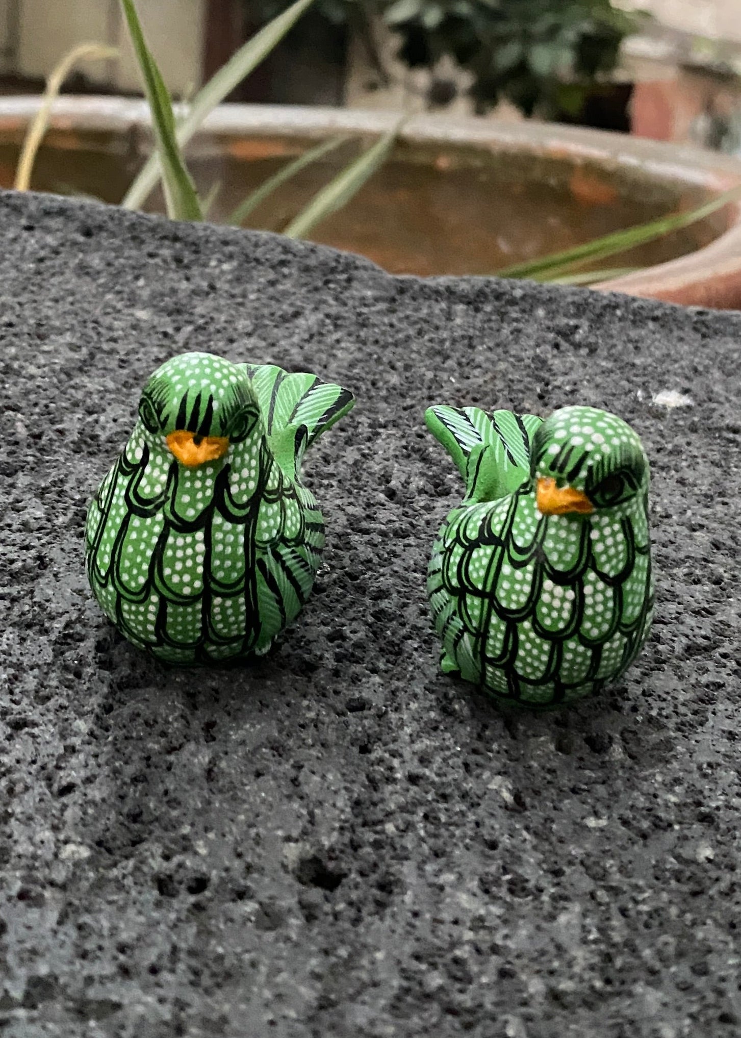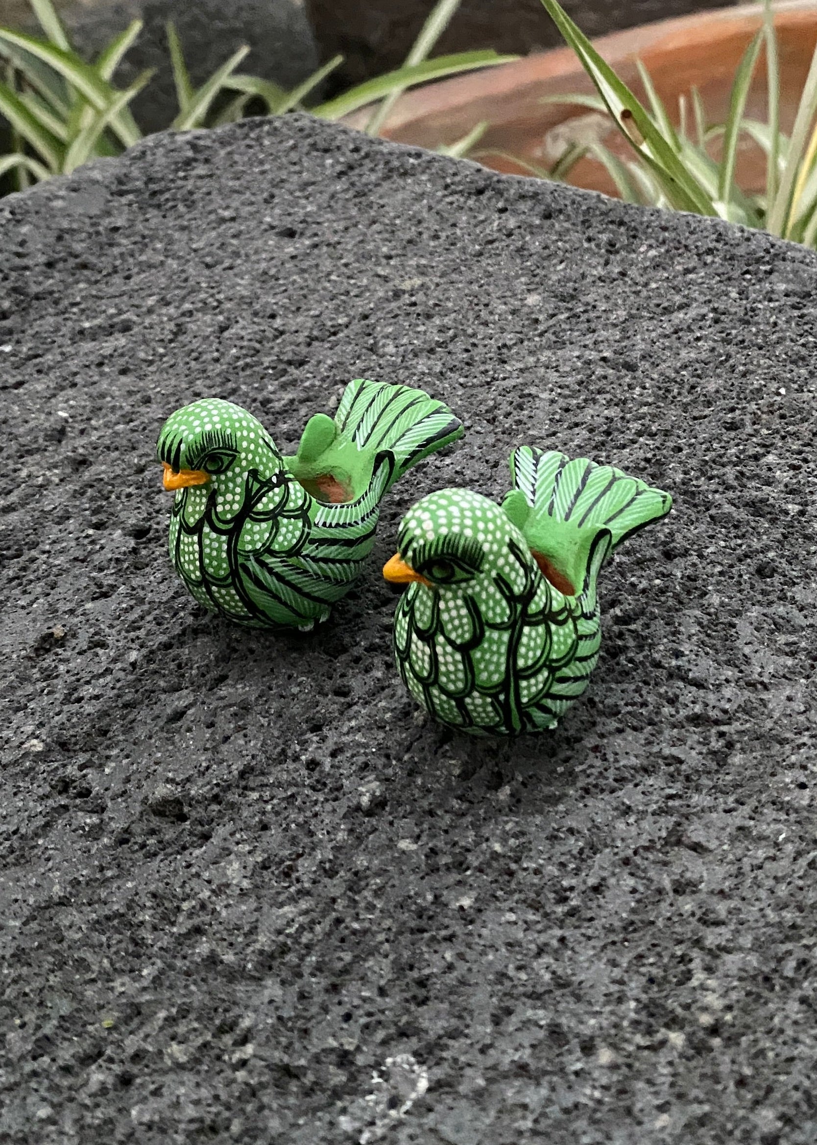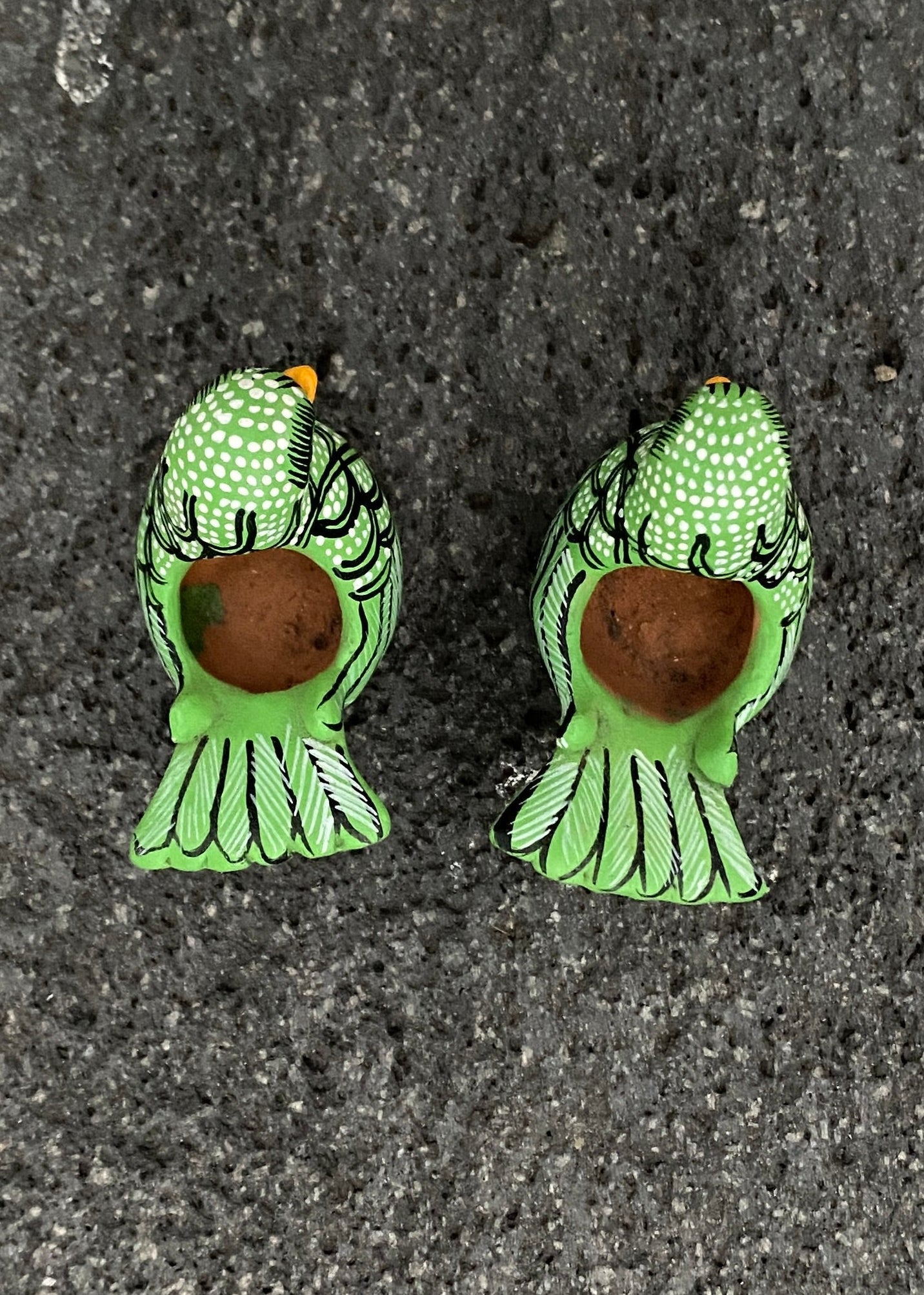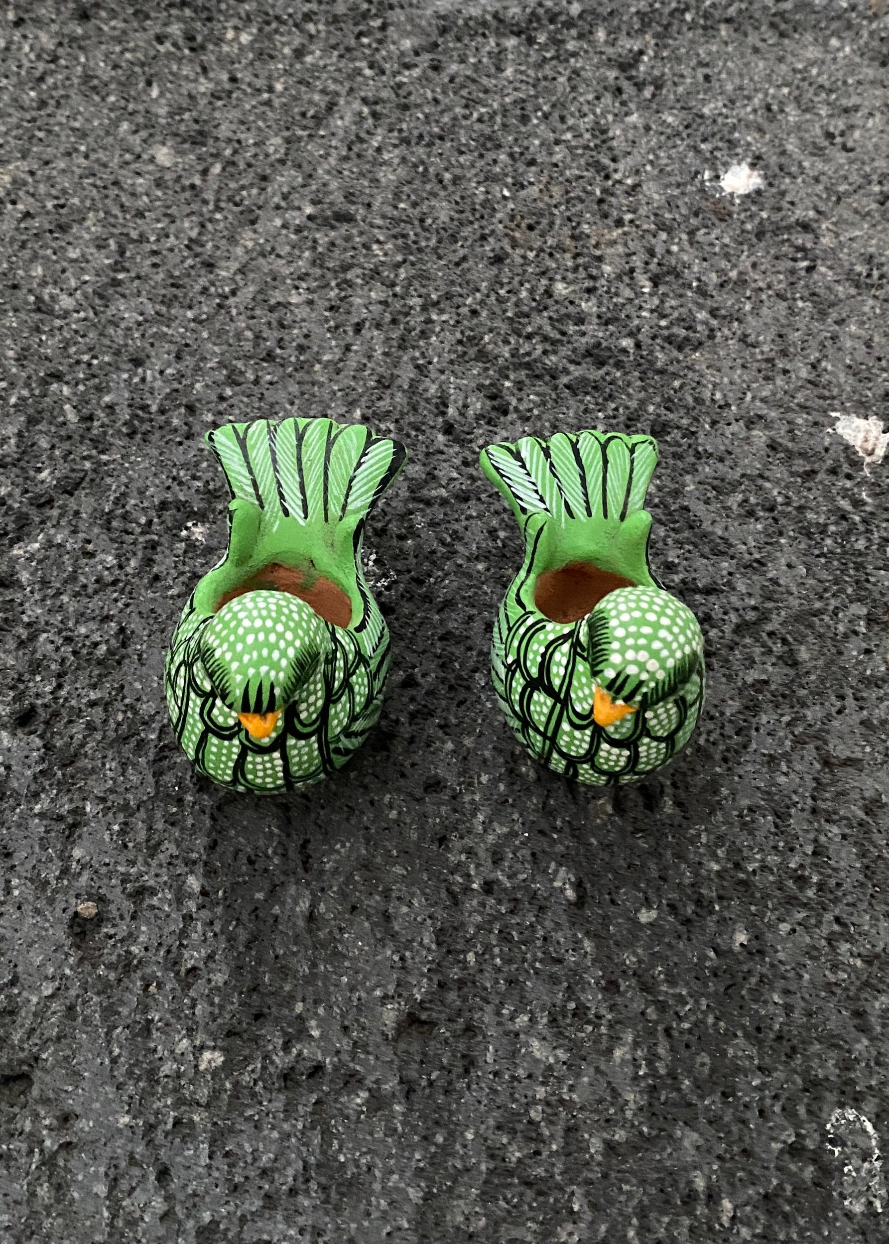 Par de palomitas miniatura de Amatenango del Valle Chiapas, son figuras miniatura modeladas a mano, detallado finamente con pinturas en color verde, blanco y negro, ideales como recuerdo de viaje, piezas coleccionables de la alfarería chiapaneca, o para colocarlas en tu espacio preferido.