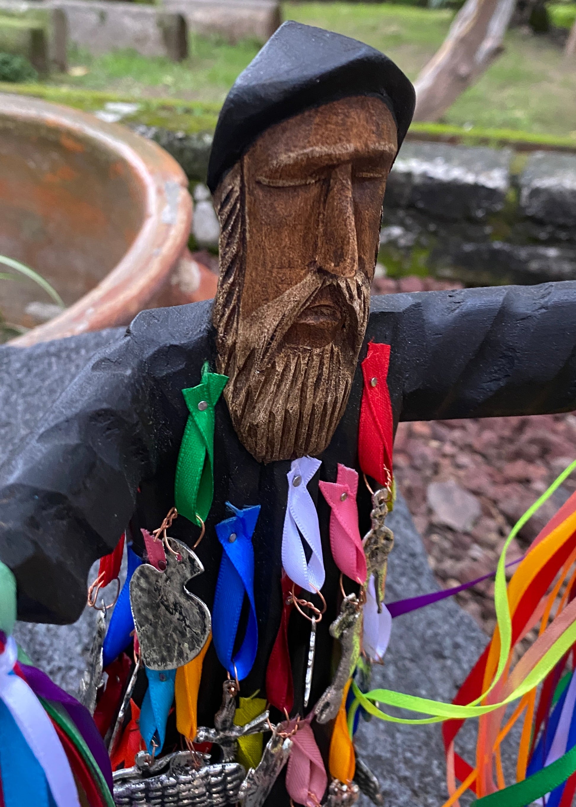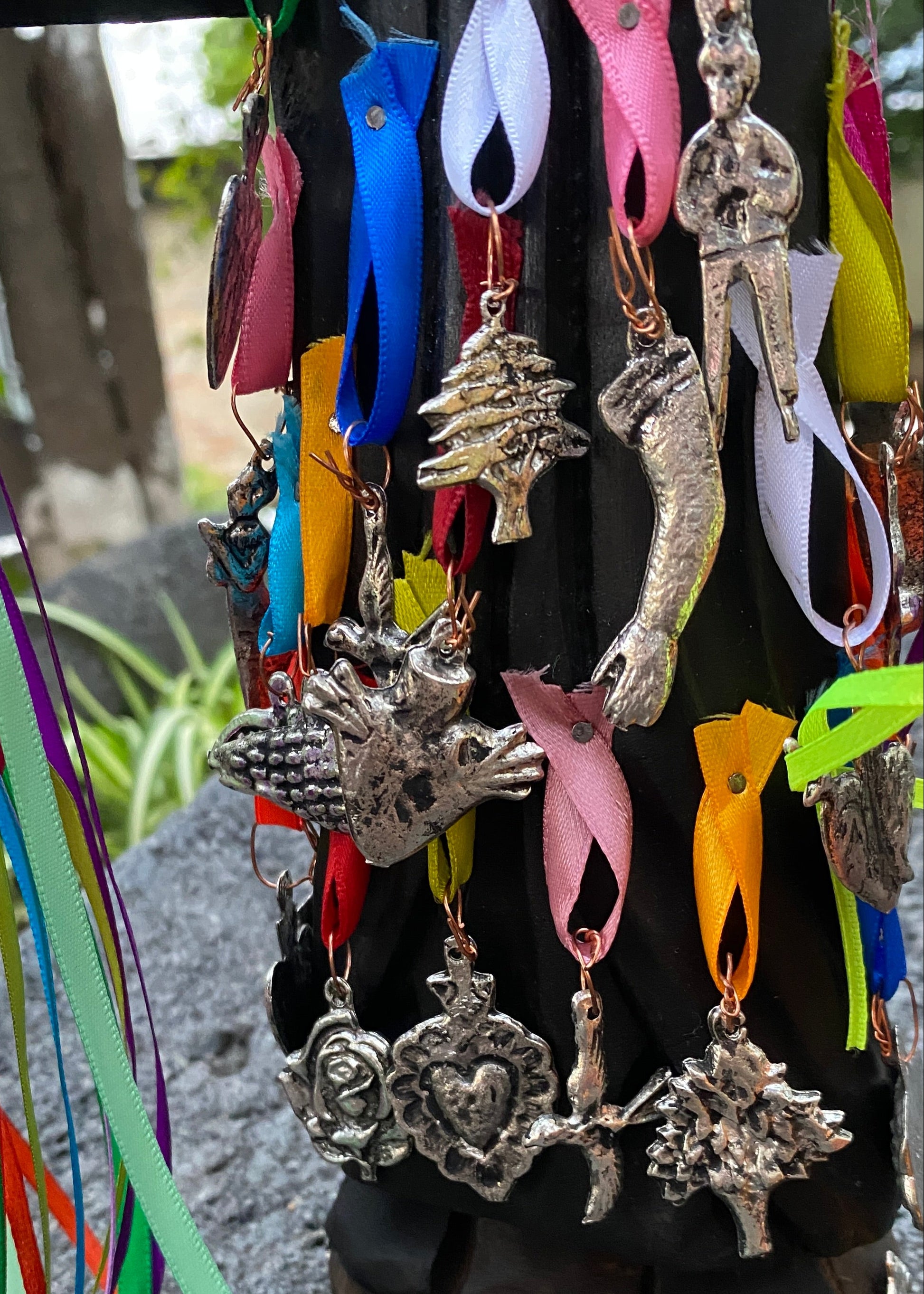 San Charbel de madera, ldecorado con milagrería, su vestimenta es en color negro cuenta con 24 milagritos en color plata sujetos con liston de diferentes colores, sujetos con un pequeño clavito, en sus muñecas tiene colgando listones de diferentes colores.
